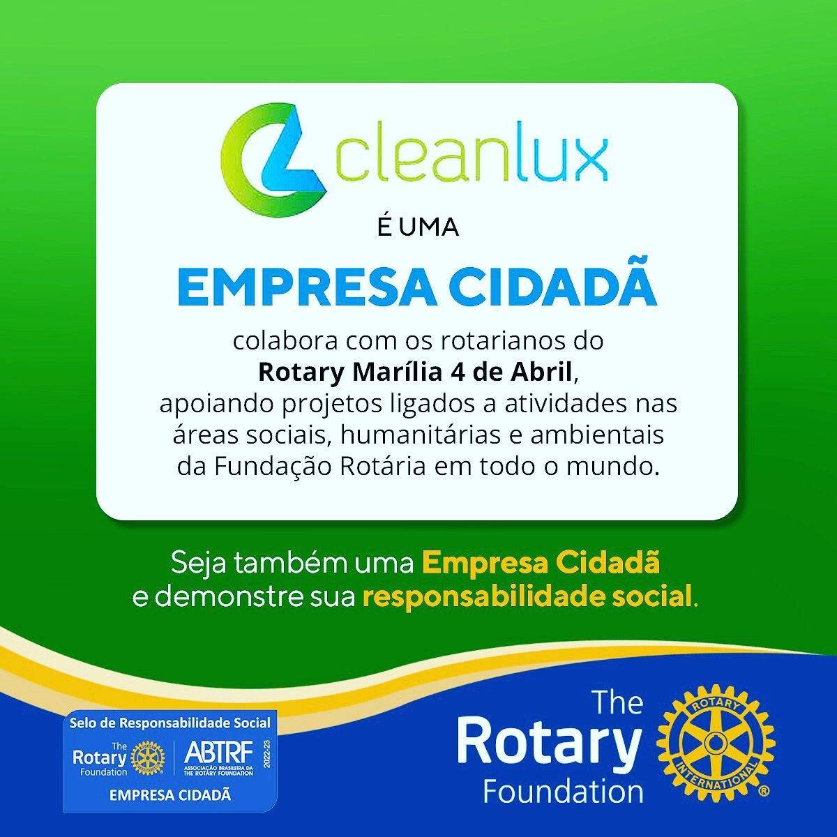Clean Lux, mais uma empresa que contribui para o Rotary Club de Marília 4 de Abril, proporcionando investimentos a projetos humanitários da Fundação Rotária, em Marília, no Brasil, e em todo o mundo.