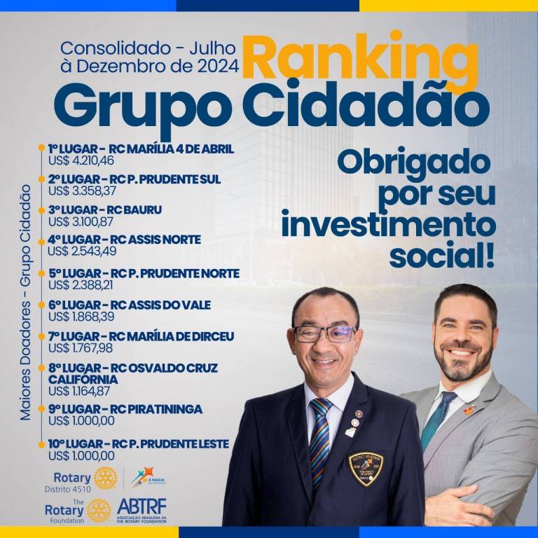 Ranking de contribuições a Fundação Rotária, dos clubes do Distrito 4510 no primeiro semestre do ano rotário 2024/2025, onde o Rotary Club de Marília 4 de Abril se classifica em 1º lugar com as Empresas Cidadãs e, em 4º lugar no Seguro Solidário que é a contribuição dos associados junto a Porto Seguro.