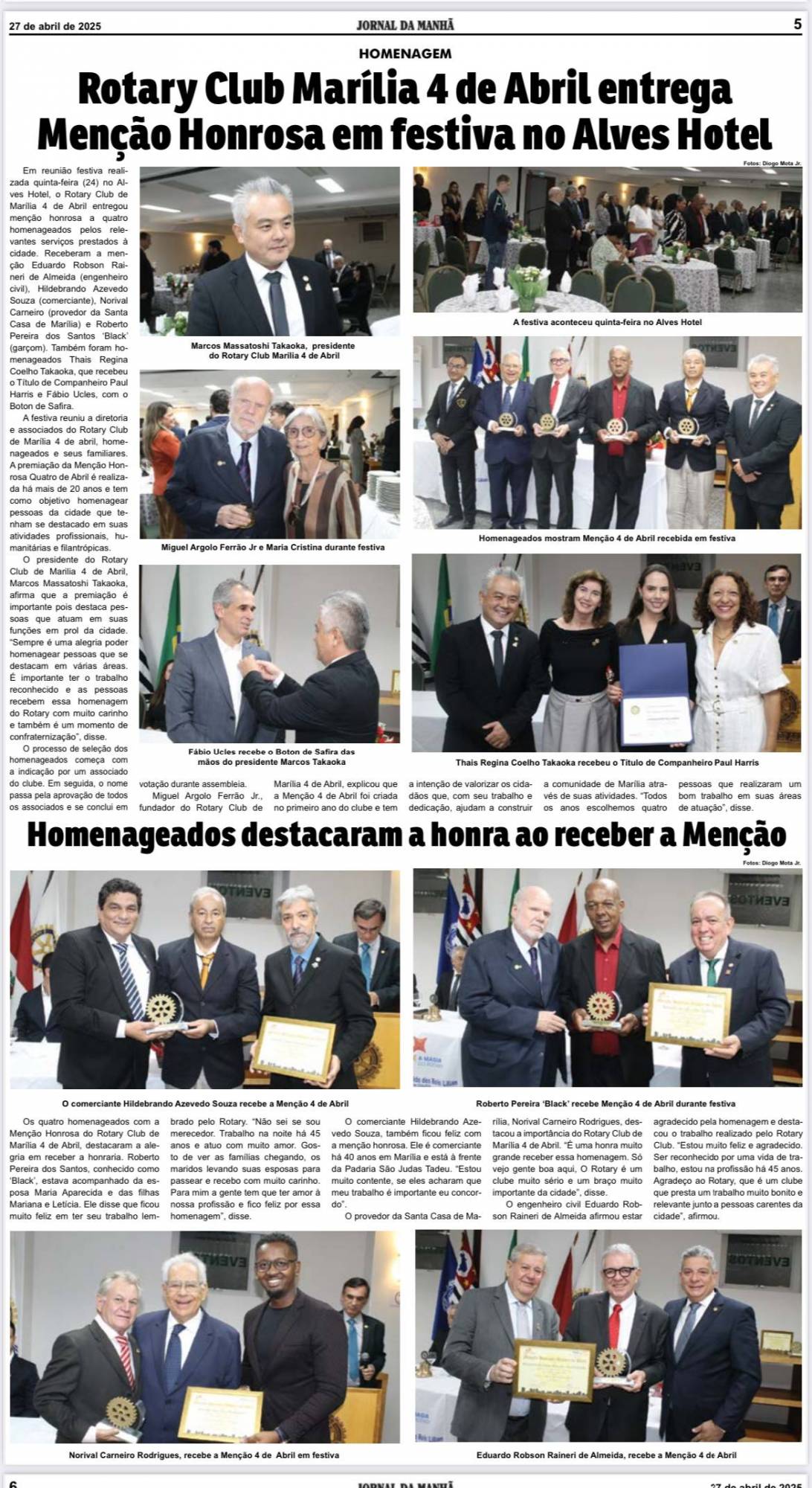 Menção 4 de Abril 2025, foram homenageados: Eduardo Robson Raineri de Almeida da Construtora Pacaembu, Hildebrando Azevedo Souza da Padaria São Judas Tadeu, Norival Carneiro Rodrigues provedor da Santa Casa de Marília e Roberto Pereira dos Santos, conhecido como Black, garçon a 45 anos em Marília. Receberam do Rotary 4 de Abril, um Certificado e um troféu, pelo revelante serviço prestado a cidade de Marília.