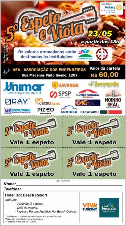 Vem aí o 5º Espeto e Viola, dia 23 de maio, realização Rotary Club de Marilia 4 de Abril, entidades beneficiadas e vendas de convites: Projeto Alvo (14) 99189-4296 e Semear (14) 3434-2837, na compra de convites concorram a 2 diárias com acompanhante no Parque Aquático Hot Beach em Olimpia, oferecimento Viva Turismo. Patrocinadores: Unimar, Havanna, Sorvemix, CAV Construtora, Cacau Foods, Crypto Mentorship Club, Moinho Real, MB Estrutural, Pizeo Engenharia, Comasa, Pacaembu Construtora, SPSP, Construcasa Bordignon e Viva Turismo.