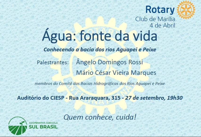 A convite do empresário Edson Zochio, Presidente do Rotary 4 de Abril, integrantes de Comitê de Bacias Hidrográficas - Aguapeí Peixe (CBH-AP) fizeram uma explanação sobre a situação dos recursos hídricos na região que inclui Marília e a maior parte das cidades do Distrito 4510. O Comitê é um órgão colegiado, de caráter consultivo e deliberativo do Sistema Integrado de Gerenciamento de Recursos Hídricos, com atuação nas Bacias Hidrográficas dos Rios Aguapeí e Peixe, formado por 14 representantes do Estado de São Paulo, 14 representantes dos municípios da região e 14 representantes da sociedade organizada.